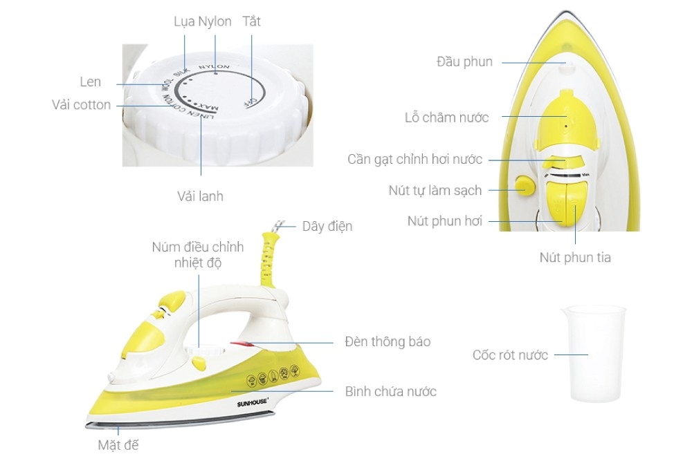 Bàn là có núm xoay điều chỉnh nhiệt độ linh hoạt, phù hợp với từng chất liệu vải như cotton, jean, kaki, lụa… Bình chứa nước tích hợp tiện lợi và đèn báo nhiệt giúp kiểm soát trạng thái hoạt động, đảm bảo an toàn khi sử dụng.