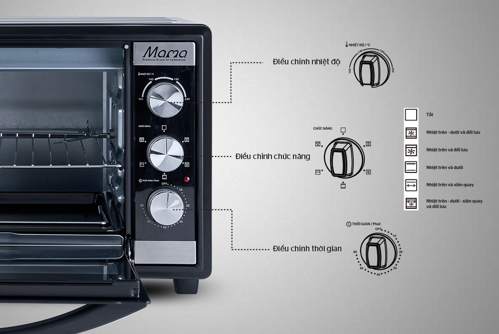 Lò được trang bị quạt đối lưu, giúp luân chuyển nhiệt khắp khoang lò, hạn chế cháy xém. Núm xoay điều chỉnh nhiệt độ từ 100–230°C cùng chế độ hẹn giờ lên đến 60 phút giúp kiểm soát quá trình nướng chính xác và an toàn.