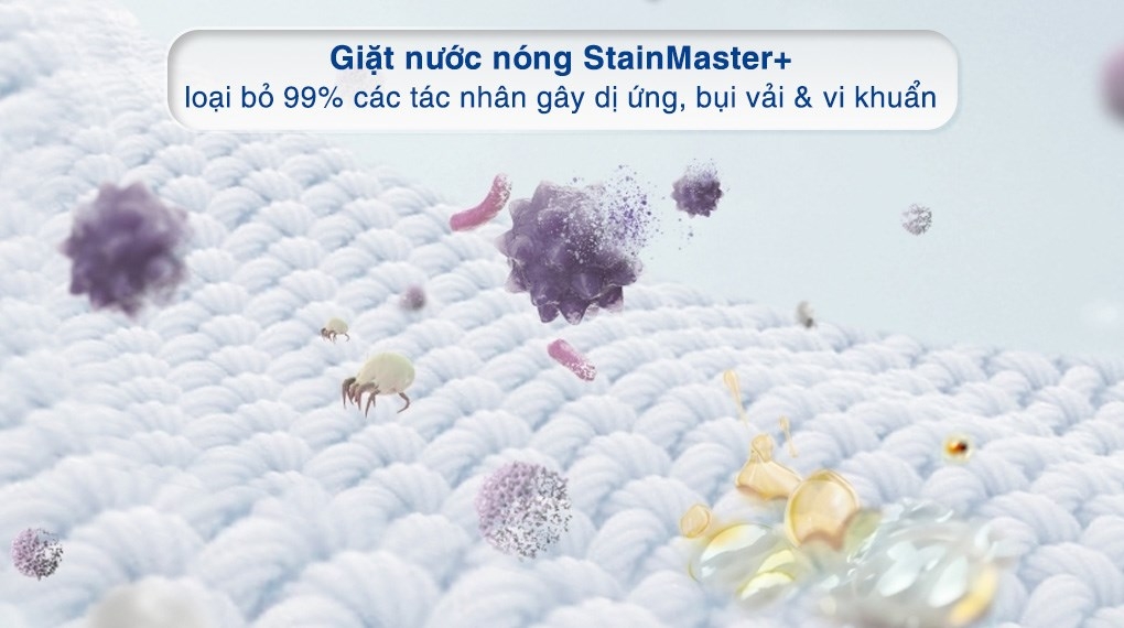 Trang bị công nghệ StainMaster+, máy có thể loại bỏ hiệu quả các vết bẩn cứng đầu như bùn đất, dầu mỡ, mồ hôi… bằng cơ chế tạo bọt siêu mịn và kiểm soát nhiệt độ nước linh hoạt.