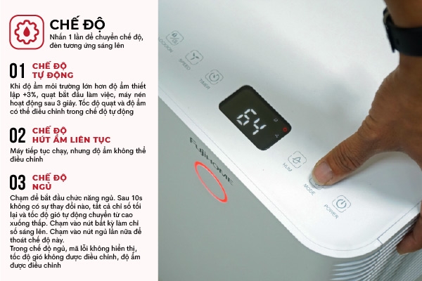 Cảm biến độ ẩm thông minh, tự động điều chỉnh hoạt động để duy trì độ ẩm ổn định từ 45–60%.