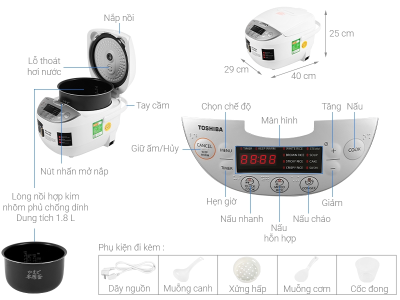 | Chế độ nấu | Cơm trắng, cơm nếp, gạo lứt, cháo, súp, hấp, làm bánh, cơm cháy, sushi, cơm trộn, nấu nhanh |